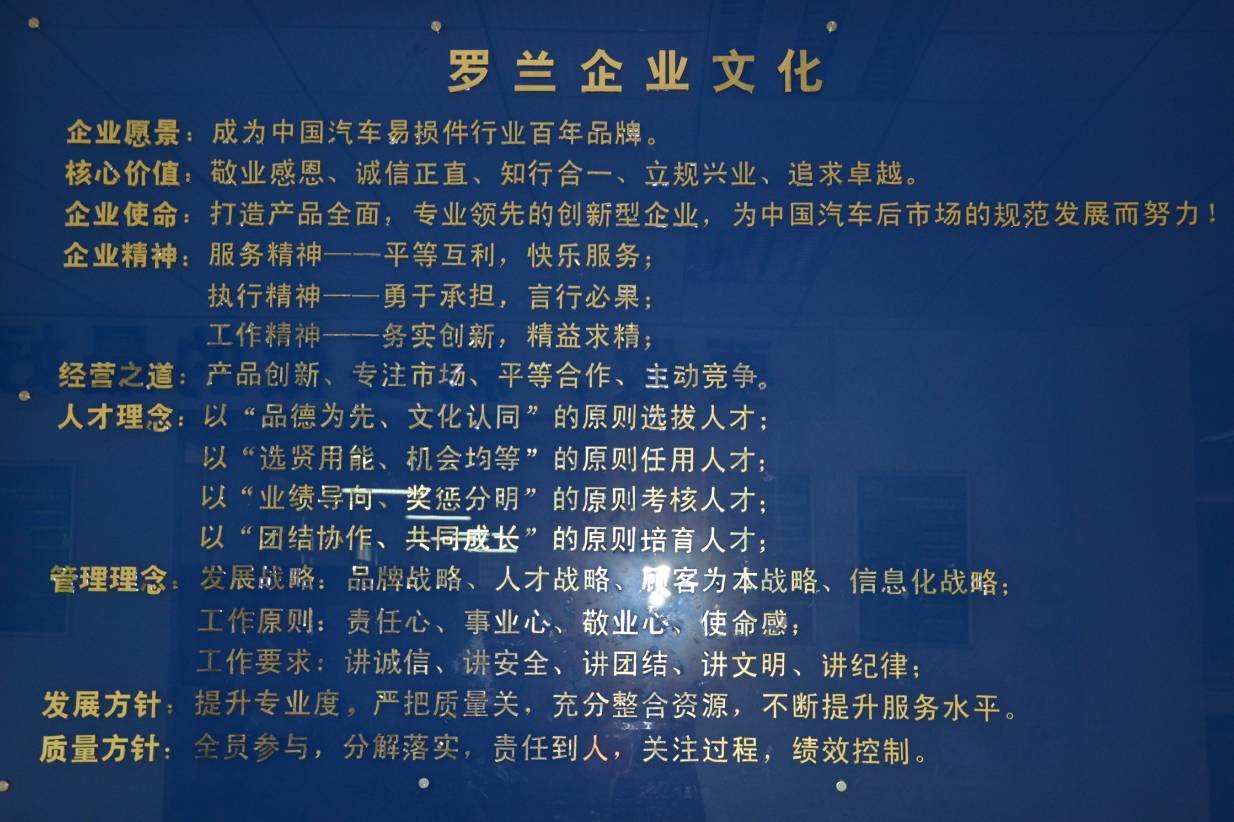 在此基础上,罗兰公司拥有一套全新的市场理念来支持公司向纵深发展,为更好的服务市场,推动公司持续发展,经过详尽的战略规划和近12年品牌运作公司为多元化汽车零配件专业生产企业,集咨询、生产、销售、服务为一体。现主要生产经营滤清器、刹车片、雨刷片等优质汽车易损件产品。公司现有员工500余人,下辖零配件生产厂、印刷厂、模具厂等5个下属企业。公司产品品类2000余种,在全国大中城市拥有400余家汽配经销商。