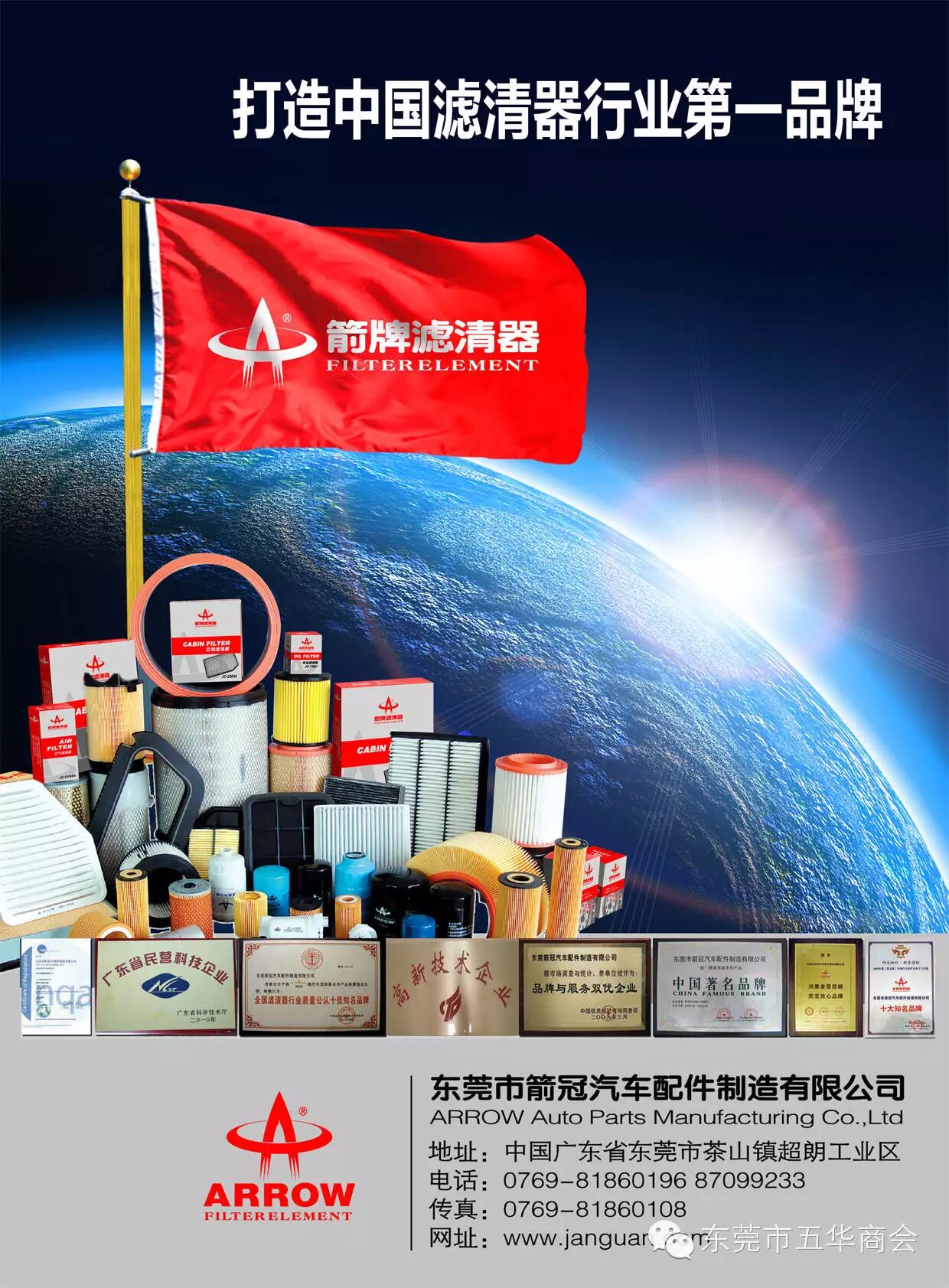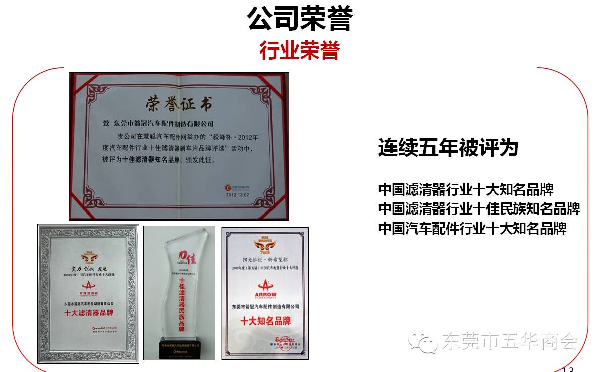经过十三年的摸索和历练,箭冠企业集团已积累了丰富的行业经验,具备了敏锐的行情触觉,奠定起良好的发展基础──先进的经营战略和企业文化,科学高效的组织架构和优秀团队,系统完善的业务规程,稳定高效的营销网络,以及高知名度和美誉度的产品品牌和服务品牌。企业现有员工600多人,(其中大中专以上学历占25%),生产产品品种有3000多种。营销网络已覆盖国内90%的大中型城市,目前国内有500多个营销服务网点。随着市场覆盖率和市场占有率的不断扩大,预计企业的销售额将以稳健快速的速度持续增长。企业品牌“箭牌滤清器”连续五年被评为“中国滤清器行业十大知名品牌”的称号,2011年度被评为“中国汽配行业十大民族知名品牌”荣誉称号;2009年度被东莞市科技局评为“东莞市民营科技企业”,2010被评为“广东省民营科技企业”,2011年被评为“中国高新科技企业”的荣誉称号,是东莞市民营经济研究会重点研究企业,被评为“消费者最信赖质量放心品牌”,被地方政府评为“员工满意”企业。2013年,被评为“十佳滤清器知名品牌”和“最具投资价值刹车片品牌”。