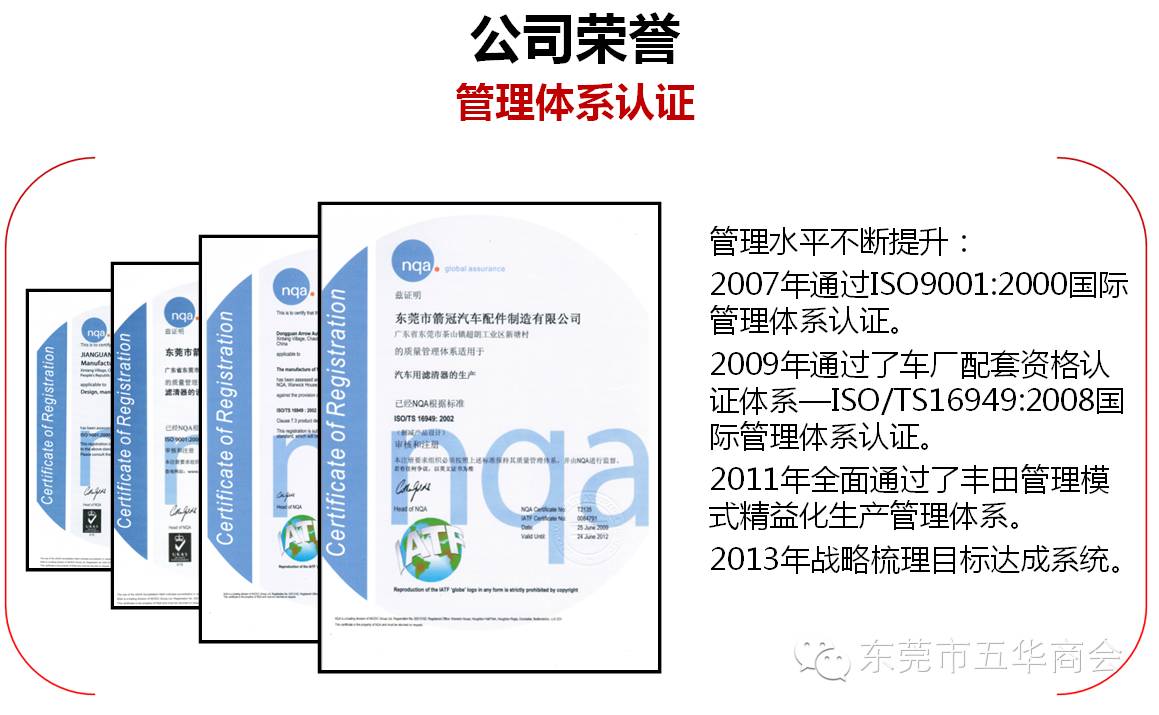 箭冠汽配制造有限公司通过了ISO9001:2000国际质量管理体系认证,全面导入ISO/TS16949:2009质量管理体系国际标准,并依据“精益化生产管理体系”建立健全了科学严密的质量保证体系,原材料采用美国、韩国高精度滤材。产品通过上海内燃机检测中心测试检验和机械工业汽车零配件产品质量检测中心(广州)测试检验,指标显示均为优质标准。外贸出口主要销往德国、美国、加拿大、欧洲、澳大利亚、东南亚、台湾、香港等国家和地区。