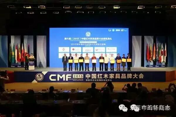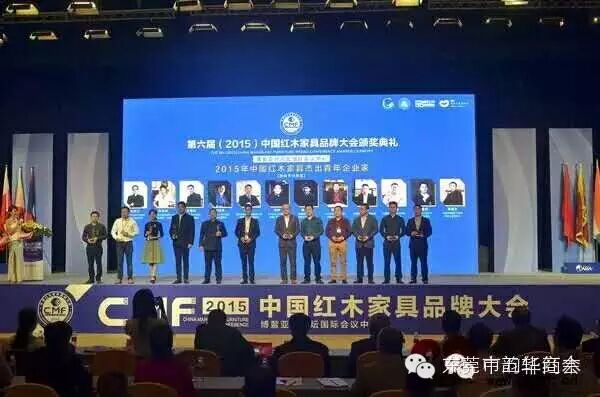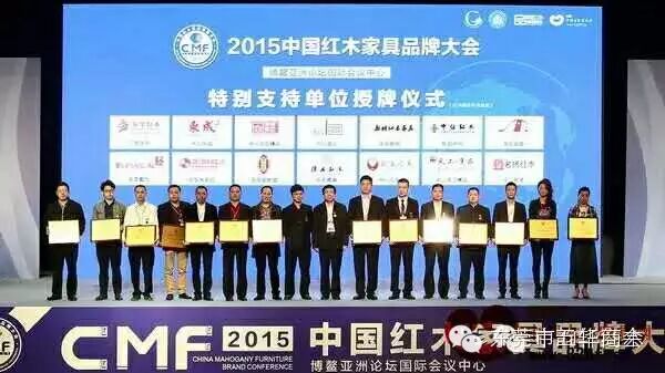 匠王红木作为2015中国红木家具品牌大会特别支持单位,董事长李茂先(右四)上台接受第六届品牌大会组委会颁牌