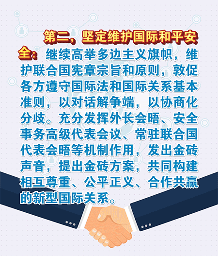第二,坚定维护国际和平安全。政治安全合作是金砖战略伙伴关系的重要内容。我们要继续高举多边主义旗帜,维护联合国宪章宗旨和原则,敦促各方遵守国际法和国际关系基本准则,以对话解争端,以协商化分歧。要充分发挥外长会晤、安全事务高级代表会议、常驻联合国代表会晤等机制作用,发出金砖声音,提出金砖方案,共同构建相互尊重、公平正义、合作共赢的新型国际关系。